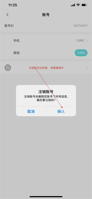 5、在弹窗中点击确认按钮,完成账号注销操作。