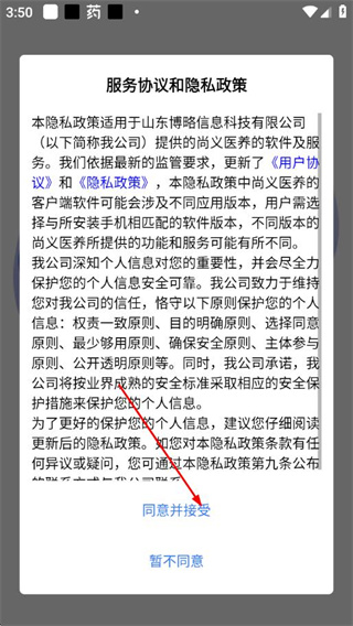 1、打开尚义医养app,在弹出的服务协议和隐私政策弹窗中点击同意并接受。