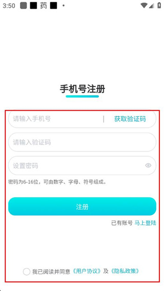 3、在注册页面填写手机号、获取并输入验证码、设置密码,勾选同意协议后点击注册。