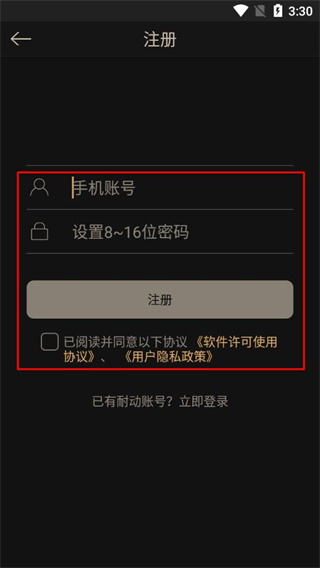 3、在注册页面填写手机账号、设置密码,勾选同意协议后点击注册。