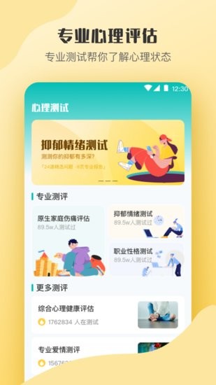 2.为所有用户提供了在线心理咨询平台,APP有着最为专业的心理咨询测评,帮你了解自己的心理状况