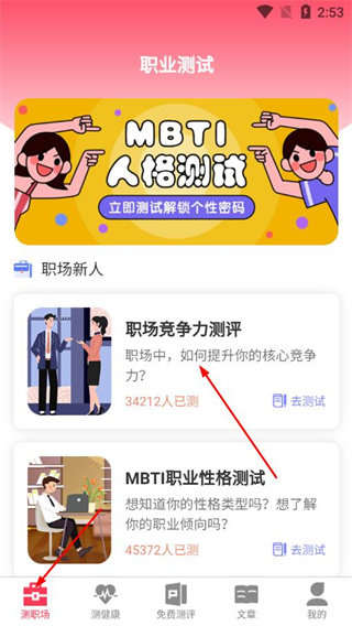 1、提供MBTI职业性格测试、职场竞争力测评等内容,了解性格对应的职业倾向。