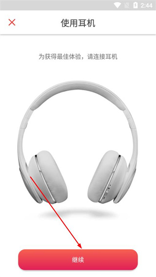 2、在使用耳机提示页,连接耳机后点击继续,进入音量设置页面。