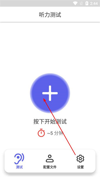 1、打开听力检测app的测试页面,点击蓝色+,进入测试准备流程。