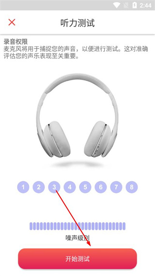 4、在听力测试页面,确认录音权限后点击开始测试,按照提示完成听力检测流程。