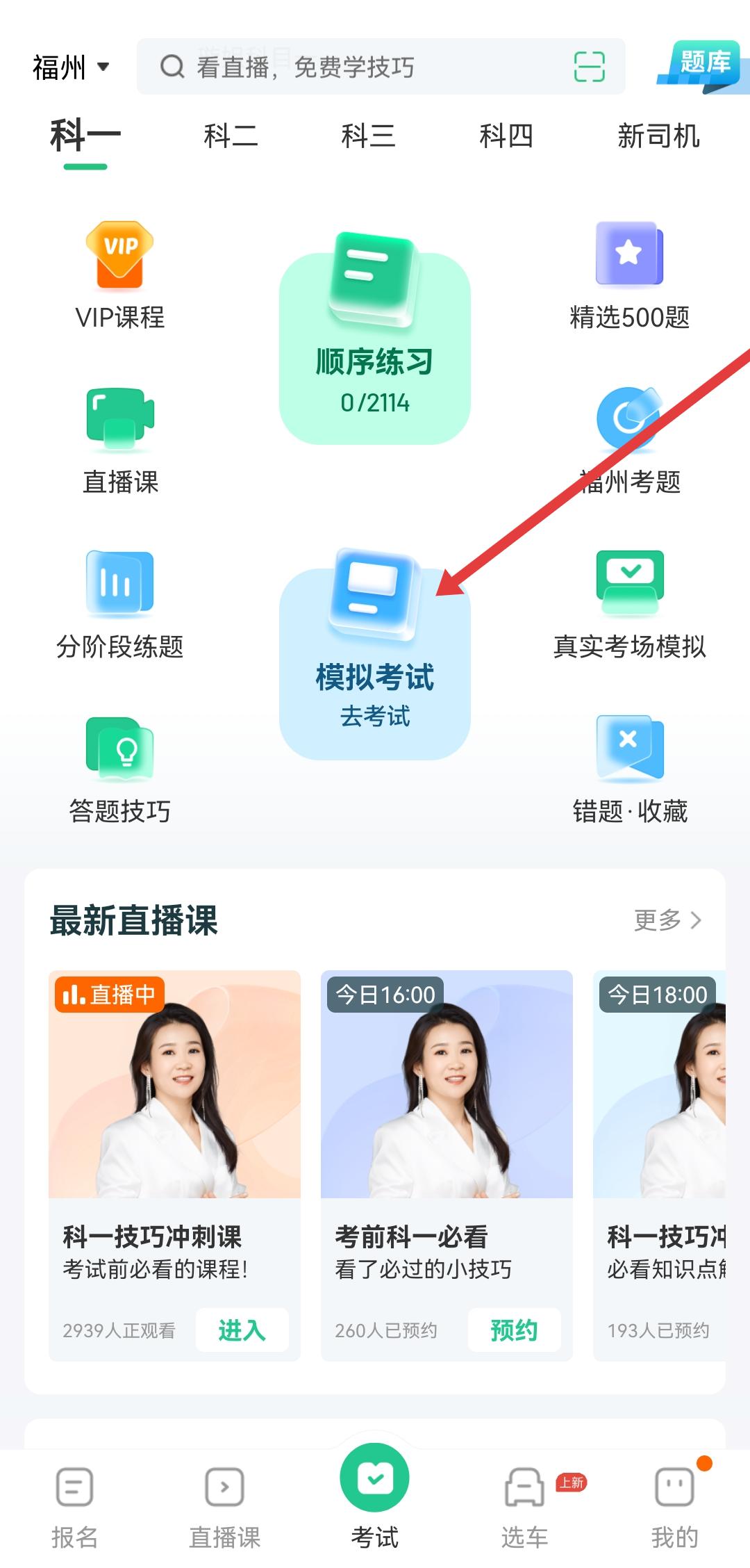 1、打开驾校一点通APP,进入考试的页面,点击模拟考试按钮,进入模拟考试准备界面。