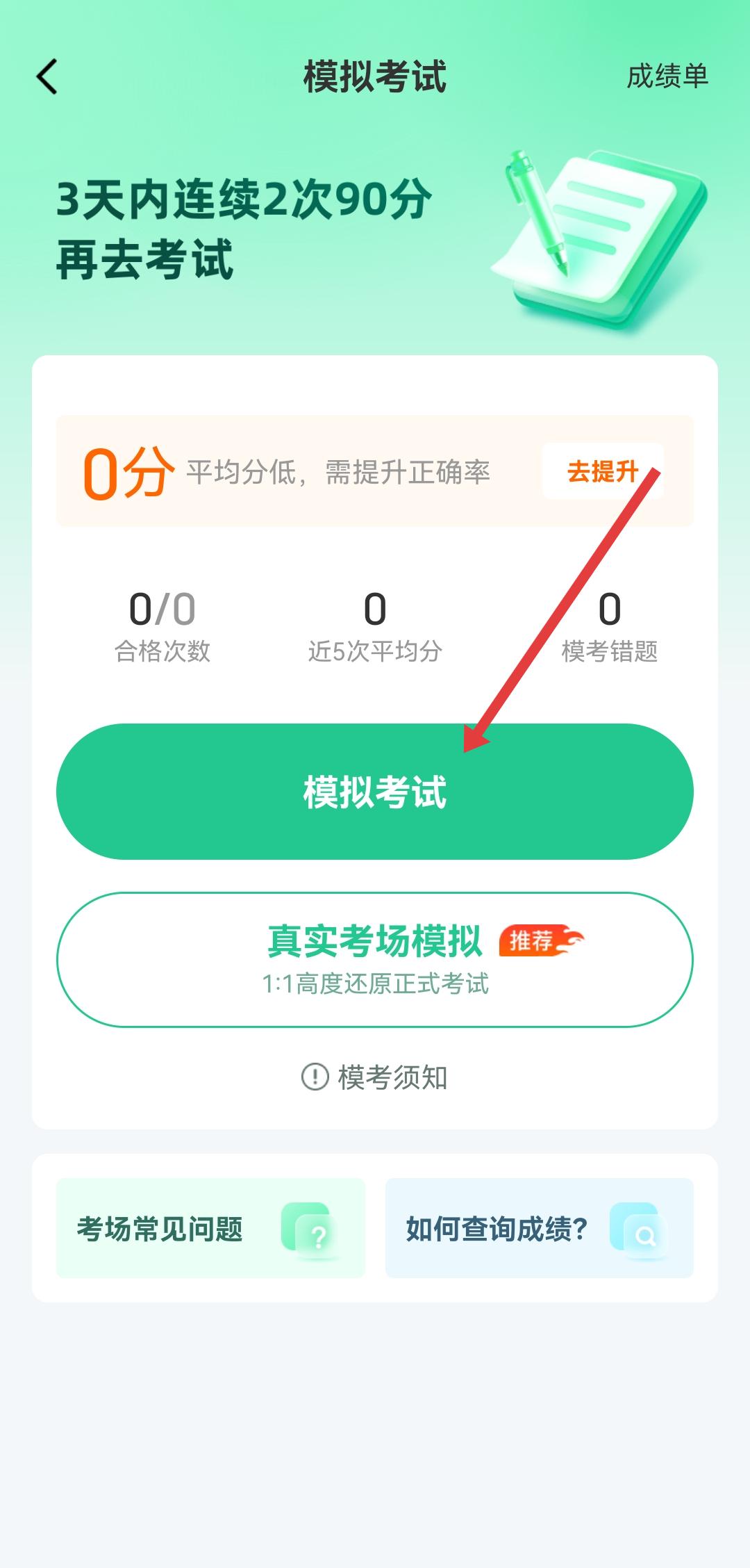 2、在模拟考试准备界面,点击绿色的模拟考试按钮,进入答题界面开始做题。