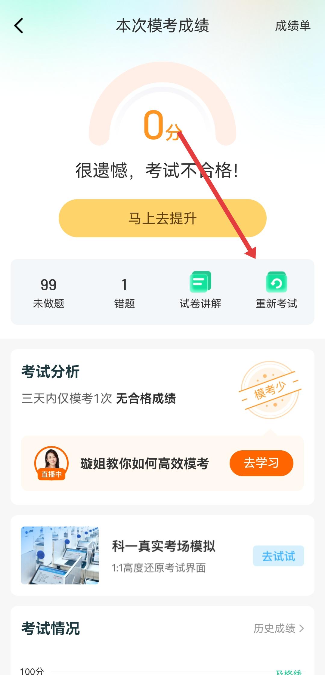 4、交卷后进入本次模考成绩页面,点击重新考试的按钮,即可重新开始做题。