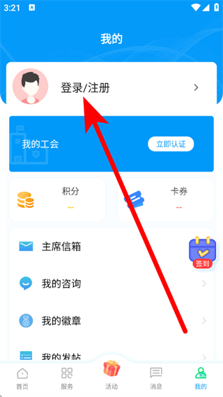 2、在个人页面,点击登录注册区域,进入登录页面。