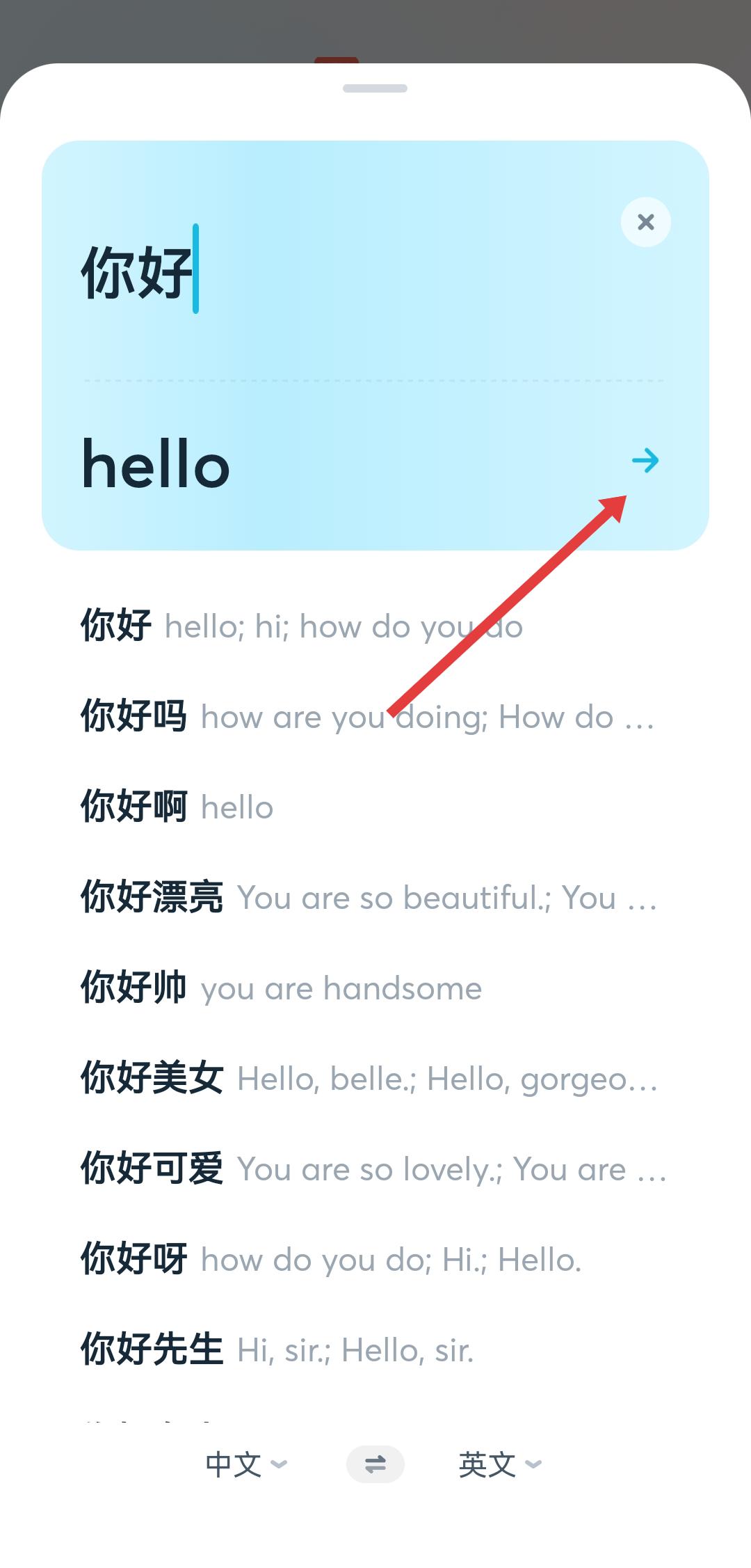 2、输入内容后,点击翻译结果区域右侧的箭头,进入详细翻译展示页面。