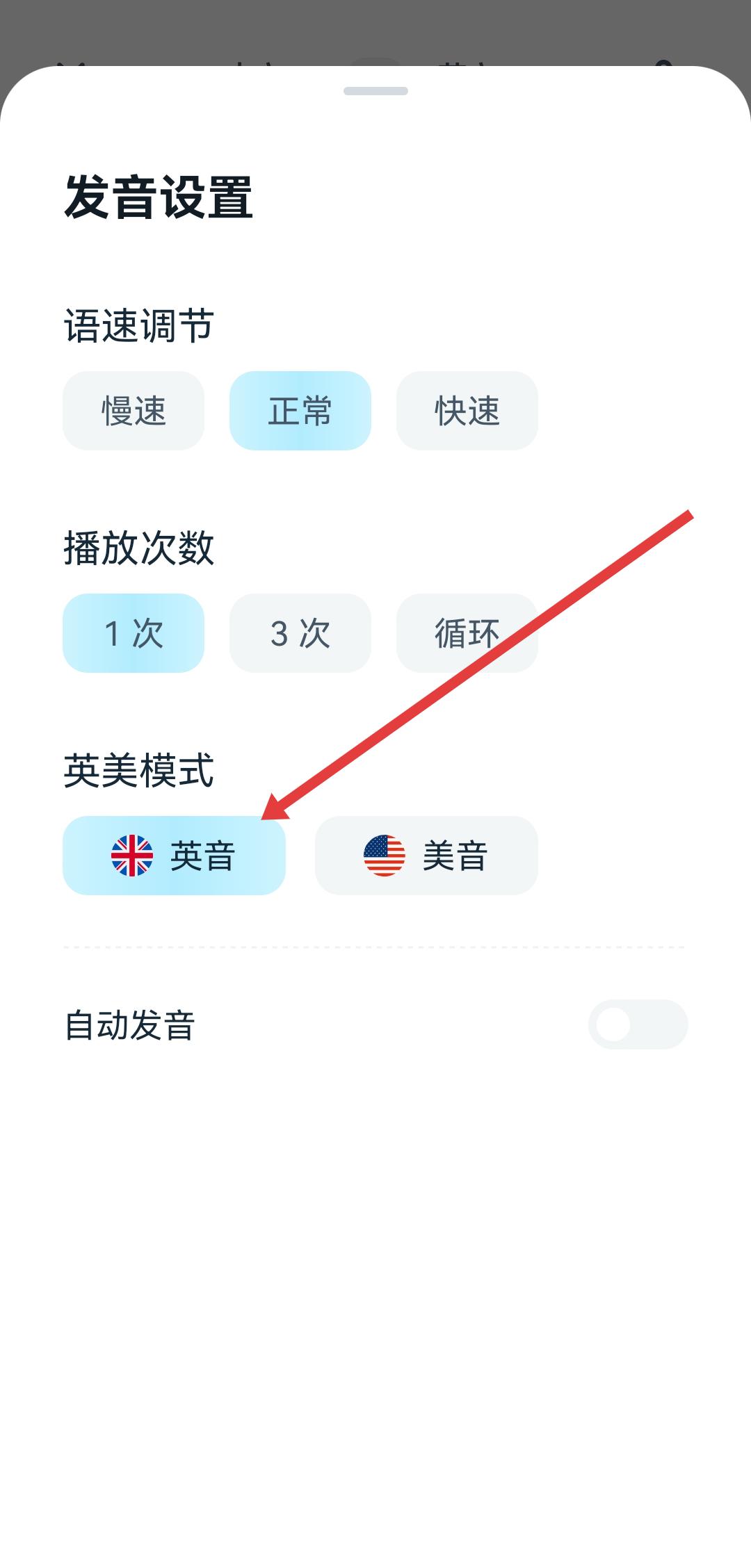4、在发音设置页面的英美模式区域,点击美音或英音按钮,即可切换发音模式。