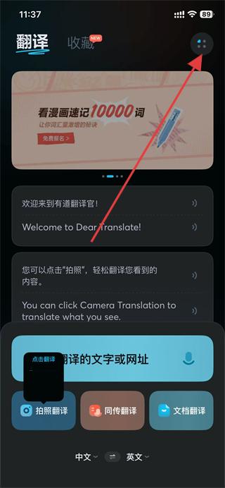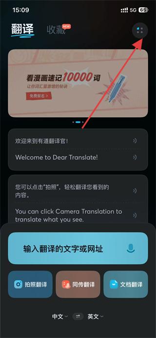1、打开有道翻译官APP,点击页面右上角的按钮。
