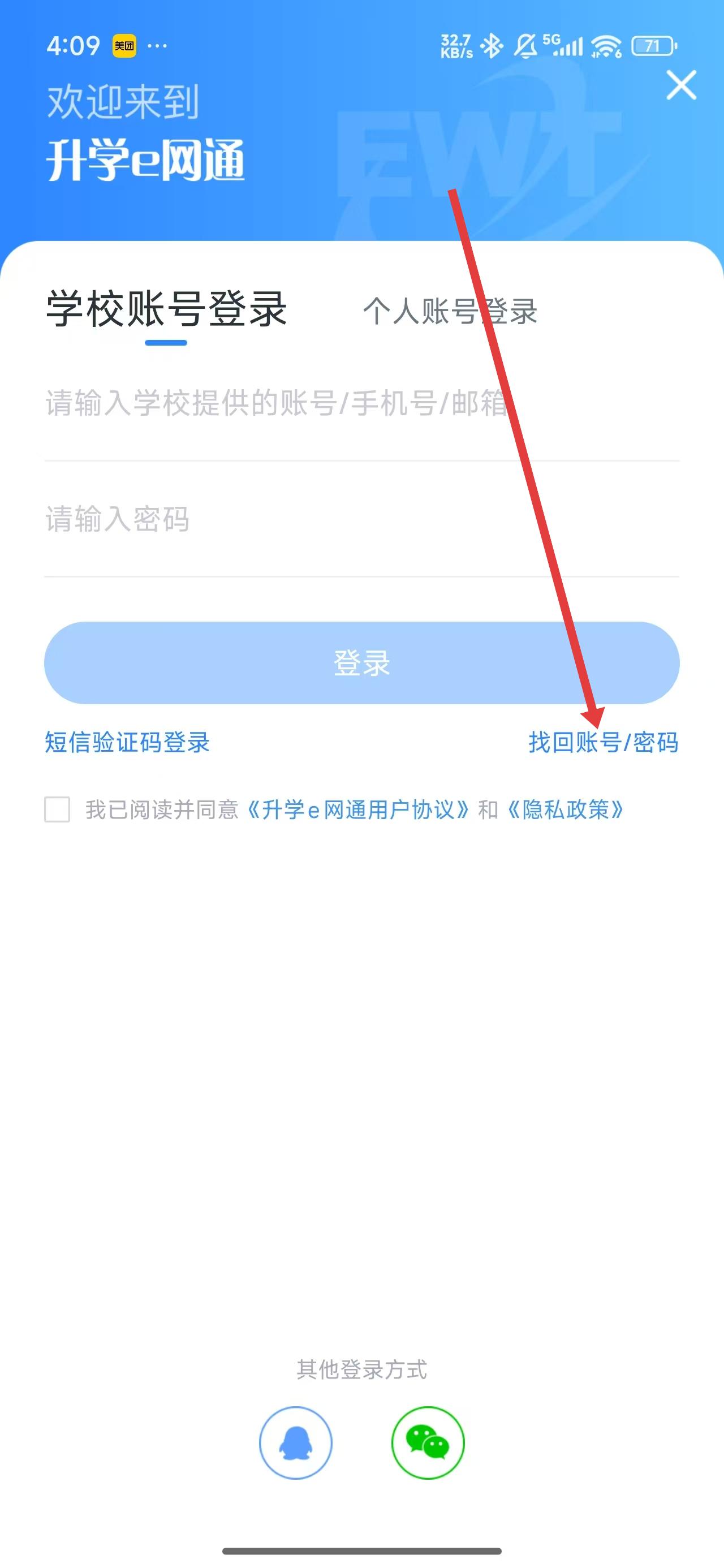 1、在升学e网通登录页面中,如果忘记了密码,可以点击下方找回账号/密码按钮解决。