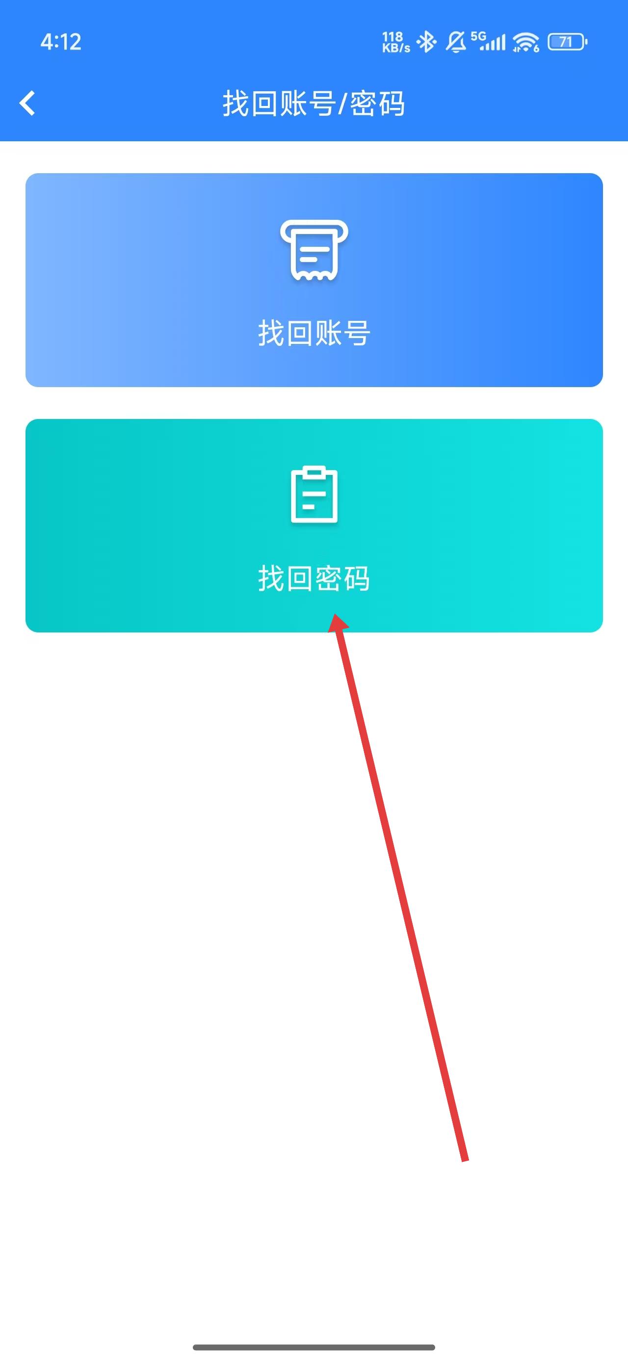 2、进入到找回账号/密码页面中,点击选择找回密码按钮,进行找回操作。