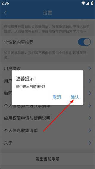 4、在弹出的提示弹窗中,点击确认,即可完成账号退出。