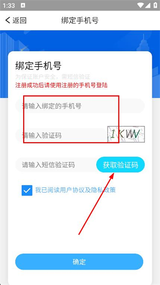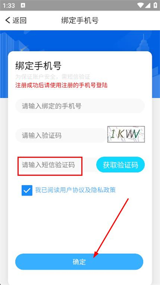 3、填入收到的验证码,点击确定按钮,即可完成手机号绑定操作。
