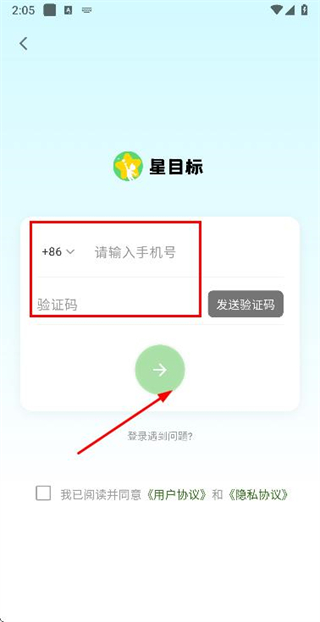 3、在手机登录页面填写手机号和验证码,勾选协议后,点击图标完成账号登录操作。