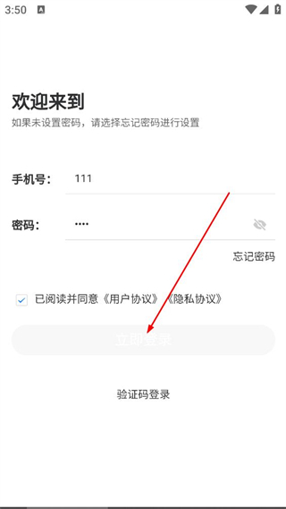 3、在账号密码登录界面,填写手机号和密码,点击立即登录完成账号登录。