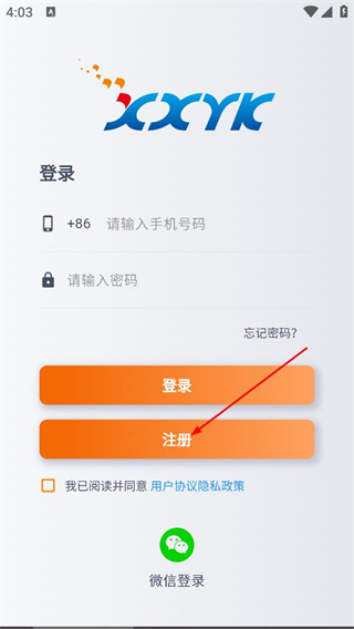 1、在登录页面,勾选我已阅读并同意用户协议隐私政策后,点击注册按钮,进入注册页面。
