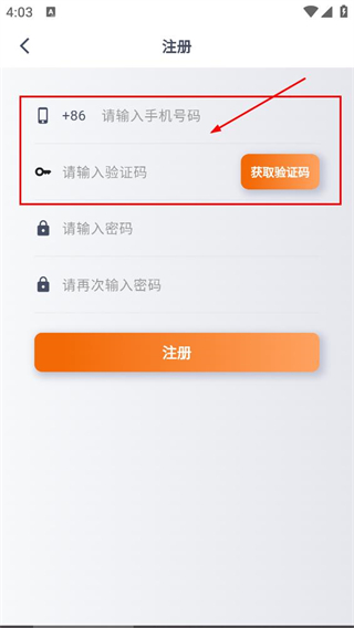 2、在注册页面,填写请输入手机号码对应的内容,点击获取验证码后填写收到的验证码。