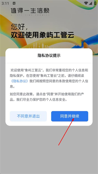 1、在象屿工管云的隐私协议提示弹窗中,点击同意,进入登录页面。