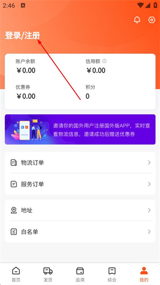 2、在个人页面中,点击登录/注册的按钮,进入登录选择页面。