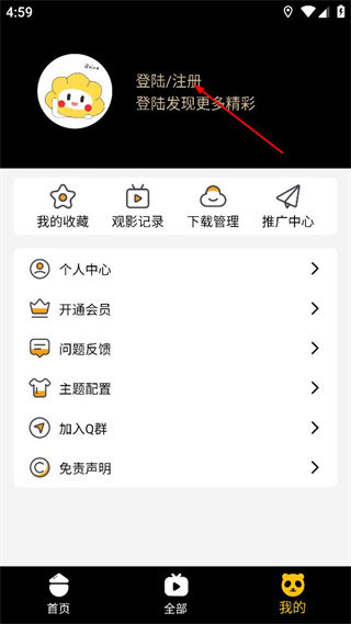 2、在个人页面中,找到登录注册选项,点击该选项后进入对应的账号登录界面。