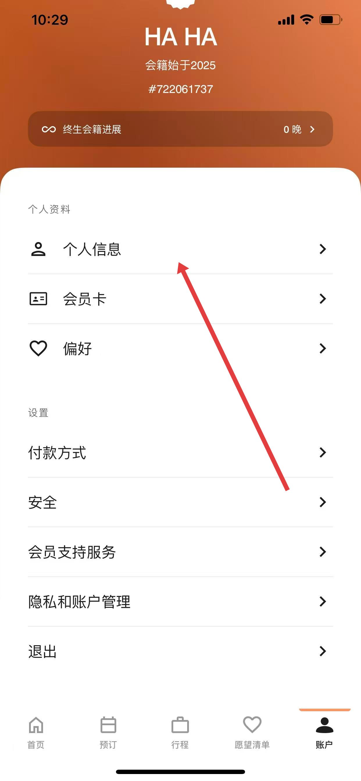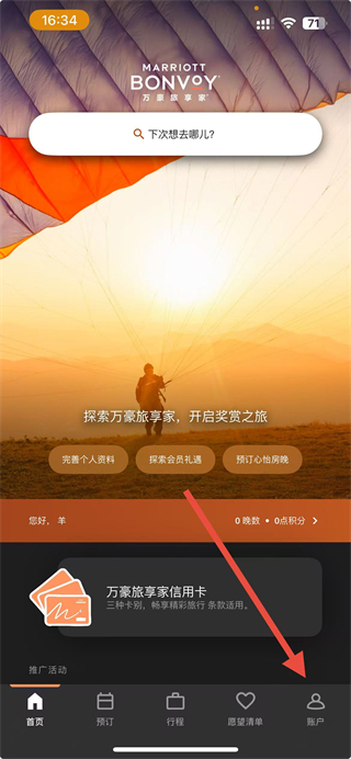 1、在万豪旅享家应用首页,找到底部的账户选项并点击,进入对应页面。