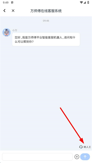 3、进入万师傅在线客服系统后,点击右下角转人工按钮。