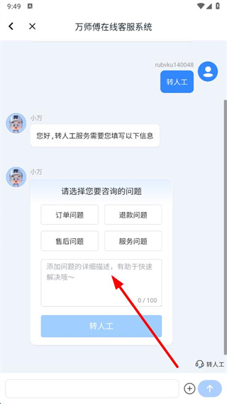 4、选择要咨询的问题类型并添加问题详细描述,点击转人工即可联系人工客服。