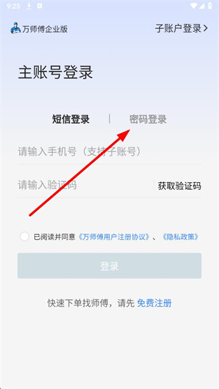 2、在主账号登录页面,点击密码登录选项,切换到密码登录界面。