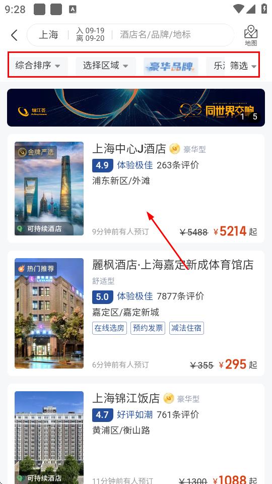 2、在酒店列表页面,可通过综合排序、选择区域、筛选品牌等方式,找到心仪的酒店并点击进入。