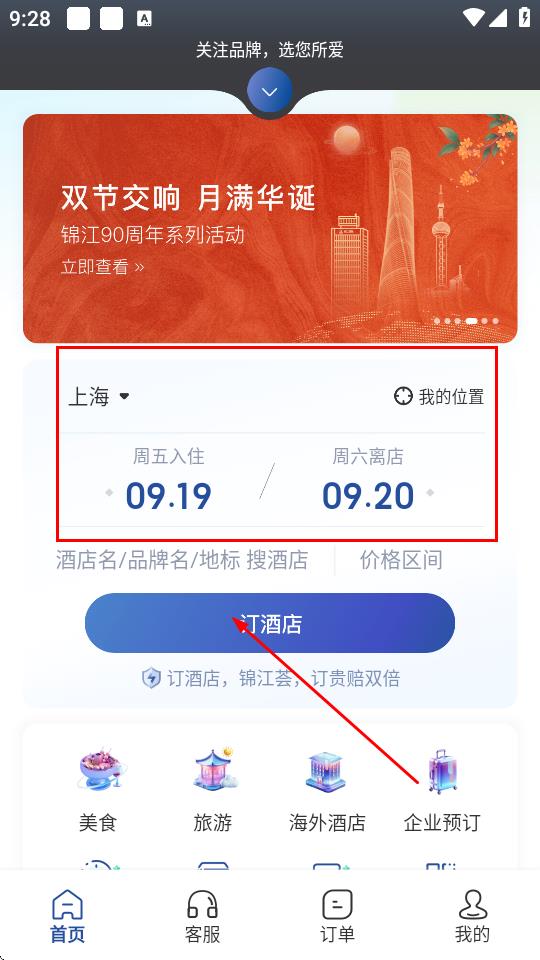 1、打开锦江荟APP,在首页选择入住城市、入住和离店日期,点击订酒店。