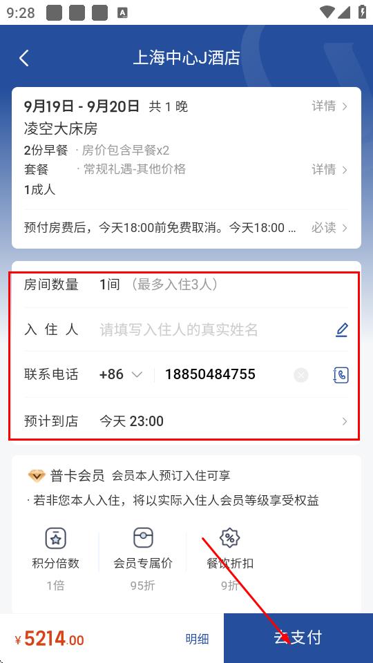 4、在预订页面,填写入住人、联系电话、预计到店时间等信息,点击去支付,完成支付即可完成酒店预订。