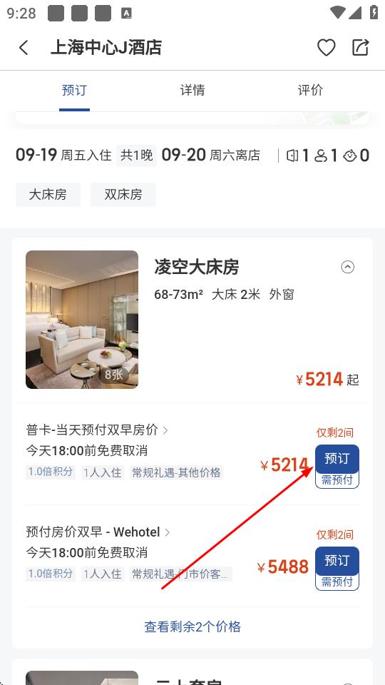 3、进入酒店详情页后,选择合适的房型,点击预订。