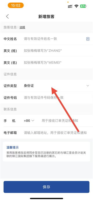4、在新增旅客页面,依次填写信息,确认无误后点击保存,即可完成旅客信息的添加。