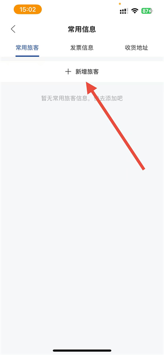 3、在常用信息页面,点击常用旅客标签下的新增旅客按钮,进入旅客信息填写页面。