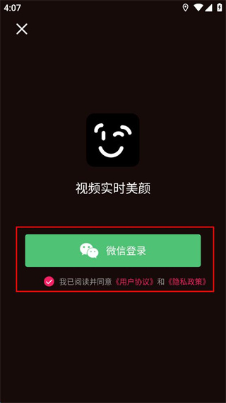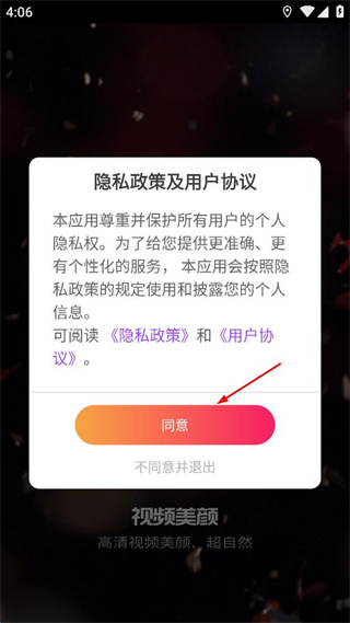 1、打开视频美颜软件,看到隐私政策及用户协议弹窗,点击弹窗里的同意按钮,完成协议确认。