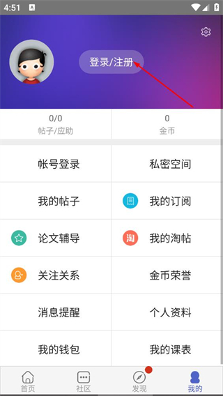 2、在个人页面中,点击登录/注册按钮,进入登录页面。