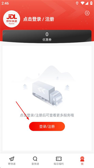 2、在个人页面中,找到登录注册按钮,点击该按钮进入京东快递的登录界面。