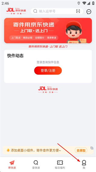 1、进入京东快递首页,找到底部导航栏的我选项,点击该选项进入对应的个人页面。