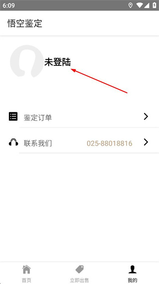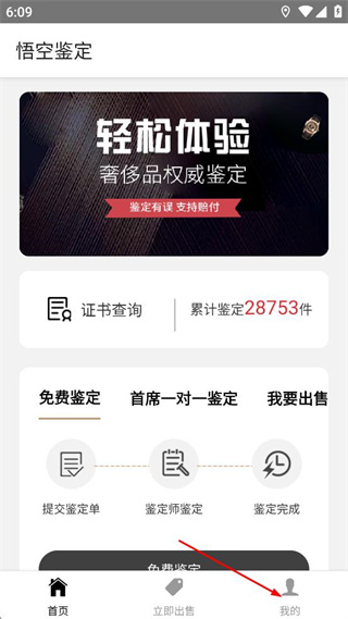1、打开悟空鉴定软件,进入首页后找到下方功能栏里的我的选项,点击该选项进入对应页面。