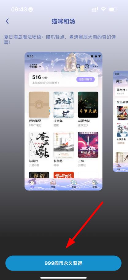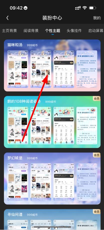 3、进入装扮中心后可选择主页背景、阅读背景等类别,如选择“猫咪和汤”主题,再点击下方按钮,花费对应阅币如999阅币永久获得该装扮。