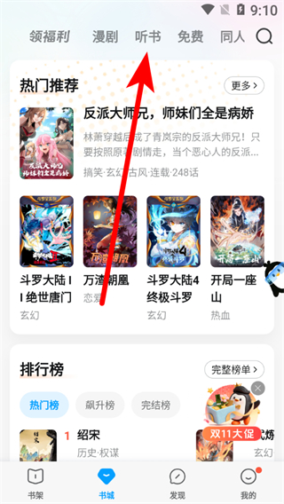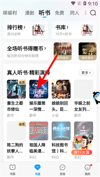 1、在QQ阅读书城页面,点击听书选项,进入听书板块。