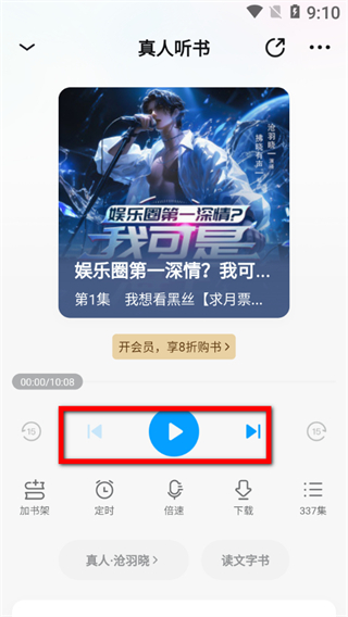 2、在听书板块,选择真人听书·精彩演绎中的书籍,进入书籍听书页面。