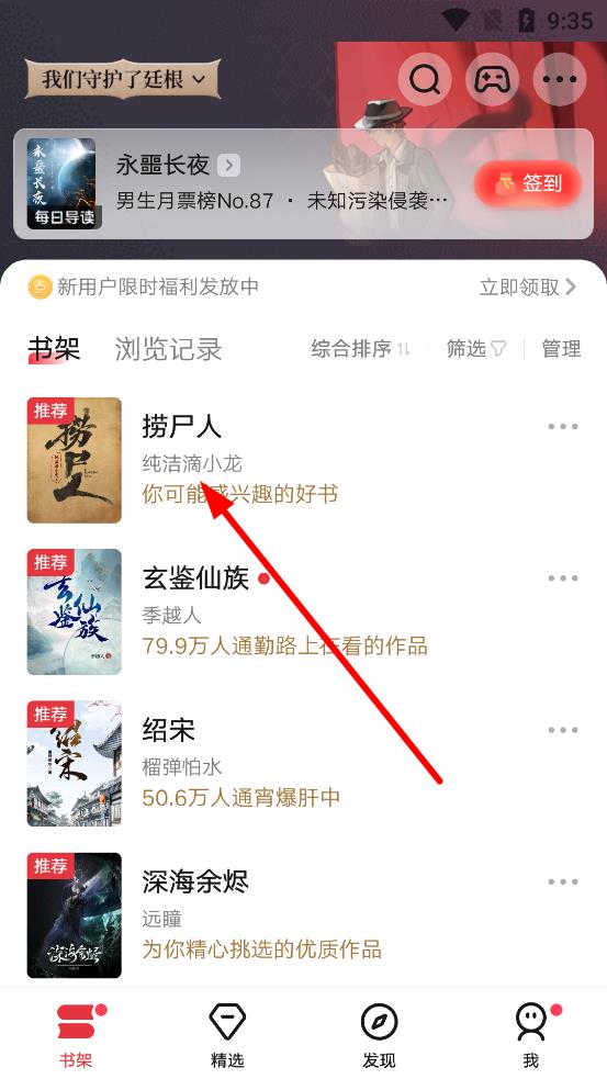 1、打开起点读书APP,进入书架页面,找到想阅读的书籍如示例中捞尸人,点击书籍封面或标题进入书籍阅读相关界面。