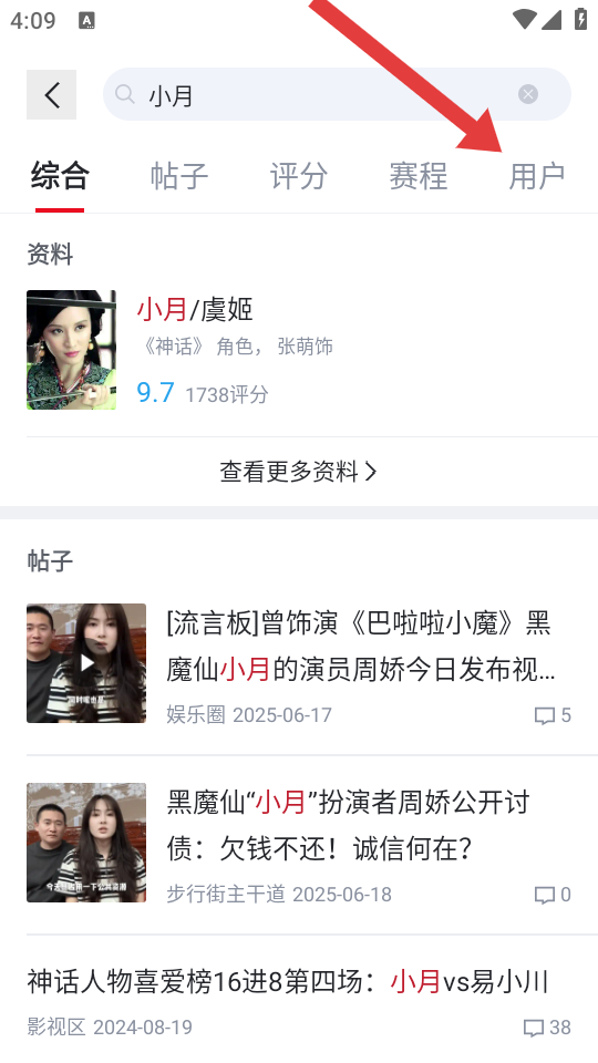 2、在搜索结果的页面,点击用户的标签,进入用户的搜索结果列表。