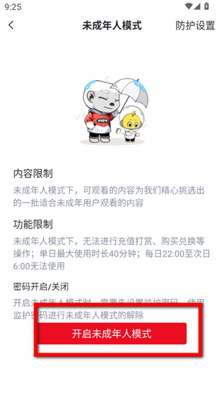 4、在未成年人模式界面,点击开启未成年人模式按钮,即可开启该模式。