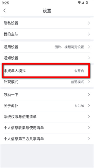 3、在设置页面,点击未成年人模式选项,进入对应设置界面。