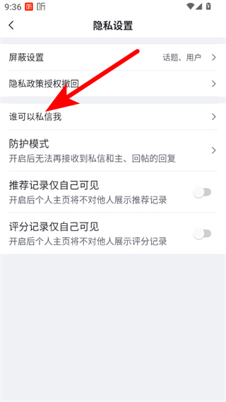 4、在隐私设置界面,点击谁可以私信我选项,即可设置能私信聊天的对象。